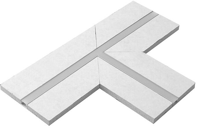 Közepes T-csatlakozó. Több különálló profilelemből áll, amelyek 12,5 mm vastag gipszkarton panelekbe vannak integrálva. Egy használatos átlátszó diffúzorral ellátva borotválkozáshoz és festéshez, valamint bepattintható matt fehér polikarbonát diffúzorral. 3 különálló elem.