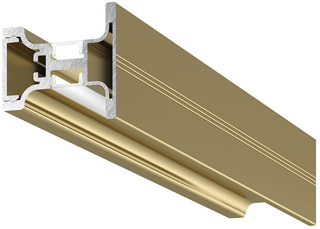 Szétszerelhető, extrudált alumínium moduláris rendszer falra szerelhető, matt fehér polikarbonát diffúzorokkal. Közvetett világítás. Szín: oxidált arany. LED szalag távoli tápegységgel, csatlakozók és zárókiegészítők rendelhetők.