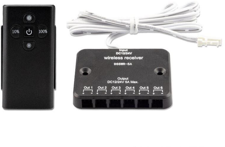 6-os elosztós MINIAMP csatlakozóval felszerelt gyorsan és egyszerűen telepíthető rádiófrekvenciás érintőgombos fényerőszabályzó. Átviteli frekvencia 2,4 GHz-es, hatótávolság 10 méterig, PWM frekvencia 500Hz Utolsó kiválasztott beállítás megmarad akkor is, ha a tápegység nincs csatlakoztatva(CR2032-es elemmel szerelve) Max. áramerősség: 5A (60/120W) Feszültség: 12-24V Kábel hossza: 100 cm Mérete: 60 x 50 x 10 mm