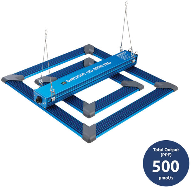 A DAYLIGHT 200W PRO LED a tökéletes megoldás kis méretű termesztéshez. Kiváló összteljesítménnyel, 500 umol/s. Ez a kompakt egység kitűnően fed le egy 80x80 cm területet teljes spektrumú fényével (beleértve a Far-Red-et is). Ezen felül, ez az egység mostantól alapból IP65-ös védettséggel rendelkezik, ami azt jelenti, hogy kevésbé kockázatos lesz a fényforrásod élettartama a termesztő helyiséged környezetében. Továbbá, több egység vezérlése is lehetséges a DAYLIGHT fényvezérlő egységen keresztül, így pontosan az adott növény igényeihez tudod igazítani a megvilágítást. Mindezt összekapcsolva a ventillátorok és mozgó alkatrészek hiányával, alacsony hőtermeléssel és a fényintenzitás szabályozásának lehetőségével (távirányítós fényerő-szabályzóval), a DAYLIGHT 300W PRO a legpraktikusabb választás minden kis méretű termesztéshez. Fő előnyei: