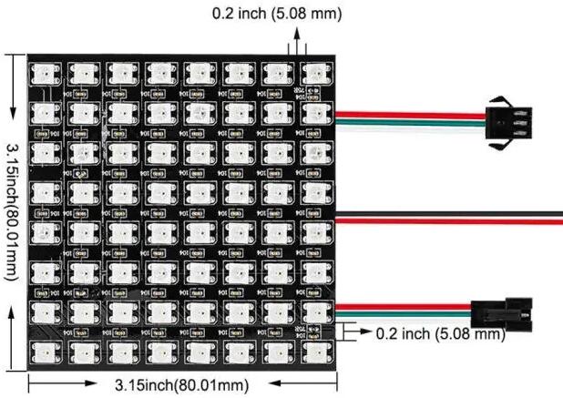 Az 8x8 pixeles hajlékony kijelző minden egyes pontja önállóan címezhető RGB LED-et tartalmaz. A kis vezérlő lábszám a WS2812 LED-chipnek köszönhető (mely a LED tokozásban helyezkedik el). A táplálás a meghajtó alappanelről vagy akár külön tápegységről is megoldható.