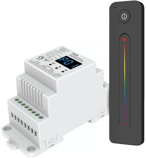 Kedvezményes csomagajánlat: SL-SK V4-D 4 csatornás RF vevő LED szalag vezérlésére 4x5A DIN sínre + SL-SK R13 RGB LED érintős távirányító fekete RF távirányítóval, vagy wifi-bridge-en keresztül okostelefonról is vezérelhető 12-24 Voltos 4 csatornás DIN sínes LED szalag vezérlő és egy kellemes tapintású, ultraérzékeny érintős felülettel rendelkező távirányító, melyen ujjunkat húzva egyszerűen állíthatjuk az RGB LED szalag színét. A BE/KI gomb nyomva tartásával a fényerő is szabályozható. Ezzel a távirányítóval a szett RGB szalagok vezérlésére képes. Részletes leírást és útmutatót a termékek különálló oldalán talál: Vezérlő > Távirányító >