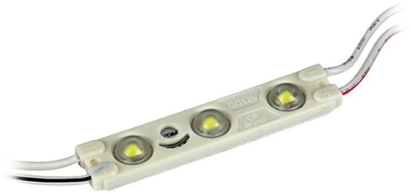 Led modul (3db 2835 SMD led, hideg fehér, 6000K)  Led modul, 3db 2835-ös méretű leddel szerelve. 90 lumen fényáram és 1 watt fogyasztás jellemzi a terméket. IP67-es védettség. Működtetéséhez 12V-os egyenáramú tápegység szükséges. A led modul kiválóan alkalmas dekorációs célokra, betűk, ábrák, világító táblák kirakására, rejtett világításhoz!